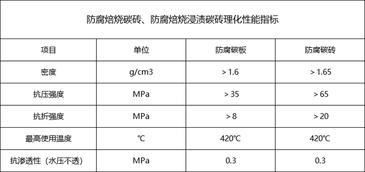 ◆防腐焙燒碳磚、防腐焙燒浸漬碳磚  一、防腐焙燒碳磚、防腐焙燒浸漬碳磚特點(diǎn)  我公司生產(chǎn)的防腐焙燒碳磚、防腐焙燒浸漬碳磚采用石油煅后焦為骨料,以煤瀝青為粘合劑,經(jīng)混捏、壓力成型、高溫焙燒工藝精制而成,具有既耐酸又耐堿而且耐高溫的性能,是化工、磷肥、電力能源、冶金、礦業(yè)、核電、石油、水處理、煙囪等的理想內(nèi)襯防腐材料?! ?、優(yōu)良的耐腐蝕性能  制品采用了石油煅后焦為骨料,以煤瀝青為粘合劑,成品具有既耐酸又耐堿而且耐高溫的性能。  2、性能穩(wěn)定、耐久性強(qiáng)  制品經(jīng)高溫焙燒,結(jié)構(gòu)穩(wěn)定,制品結(jié)構(gòu)不會(huì)隨溫度變化而發(fā)生改變?! ?、外形尺寸準(zhǔn)確  成品經(jīng)過模壓成型后再機(jī)械加工,質(zhì)量好,外形尺寸準(zhǔn)確。所有制品能按用戶要求進(jìn)行生產(chǎn),能充分滿足各種施工砌筑工藝要求。  4、防腐焙燒碳磚、防腐焙燒浸漬碳磚的理化性能指標(biāo)見下表所示。