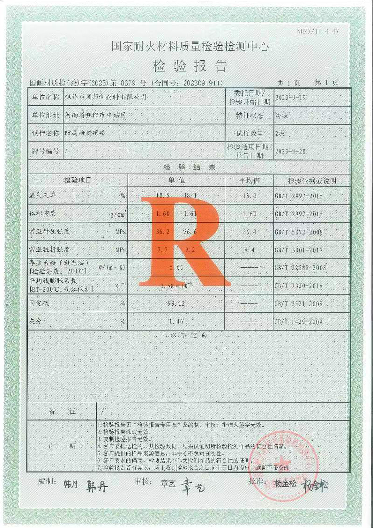 4、防腐焙燒碳磚、防腐焙燒浸漬碳磚的理化性能指標(biāo)見下表所示。